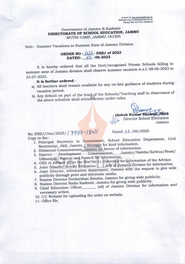 It is hereby ordered that all the Govt/recognized Private Schools falling in summer zone of Jammu division shall observe summer vacation w.e.f . 08-06-2023 to 22-07-2023.
