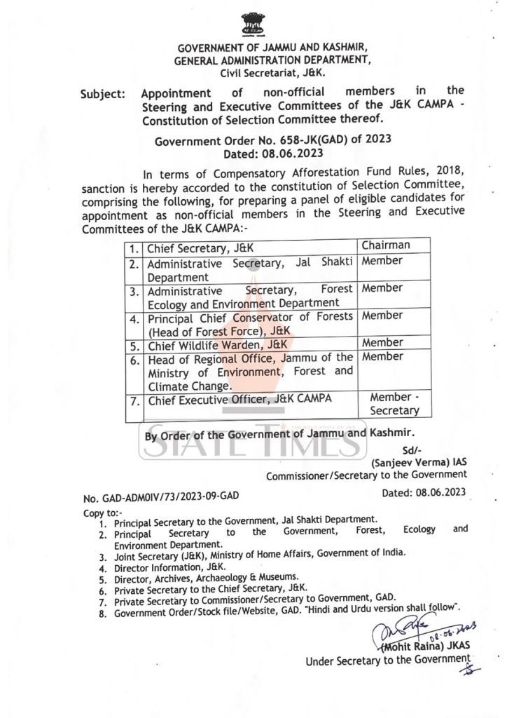 STATE TIMES NEWS In terms of Compensatory Afforestation Fund Rules, 2018, sanction is hereby accorded to the constitution of Selection Committee, comprising the following, for preparing a panel of eligible candidates for appointment as non-official members in the Steering and Executive Committees of the J&K CAMPA, read order below: