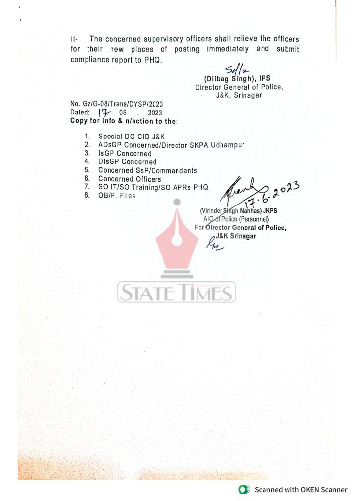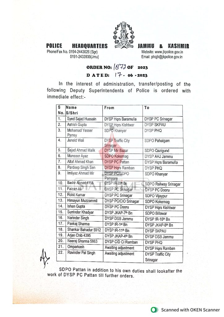 22 DySPs transferred admin June 17, 2023 Image Gallery Jammu Jammu and Kashmir Latest News Top J&K News Twitter