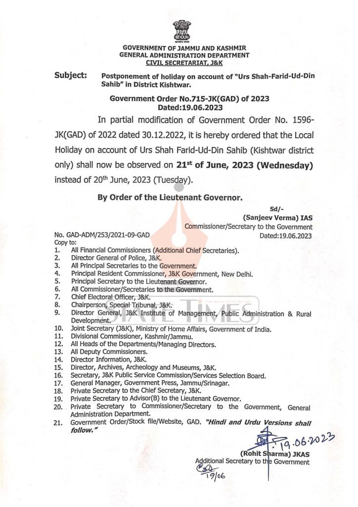 In partial modification of Government Order dated 30.12.2022, it is hereby ordered that the Local Holiday on account of Urs Shah Farid-Ud-Din Sahib (Kishtwar district only) shall now be observed on 21st of June, 2023 (Wednesday) instead of 20th June,2023 (Tuesday), read order below: