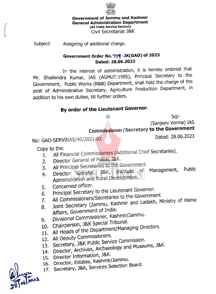 According to the order issued by Sanjeev Verma, Commissioner/Secretary, General Administration Department, Shailendra Kumar, IAS (AGMUT:1995), Principal Secretary, Public Works (R&B) Department, shall hold the charge of the post of Administrative Secretary, Agriculture Production Department, in addition to his own duties, till further orders.