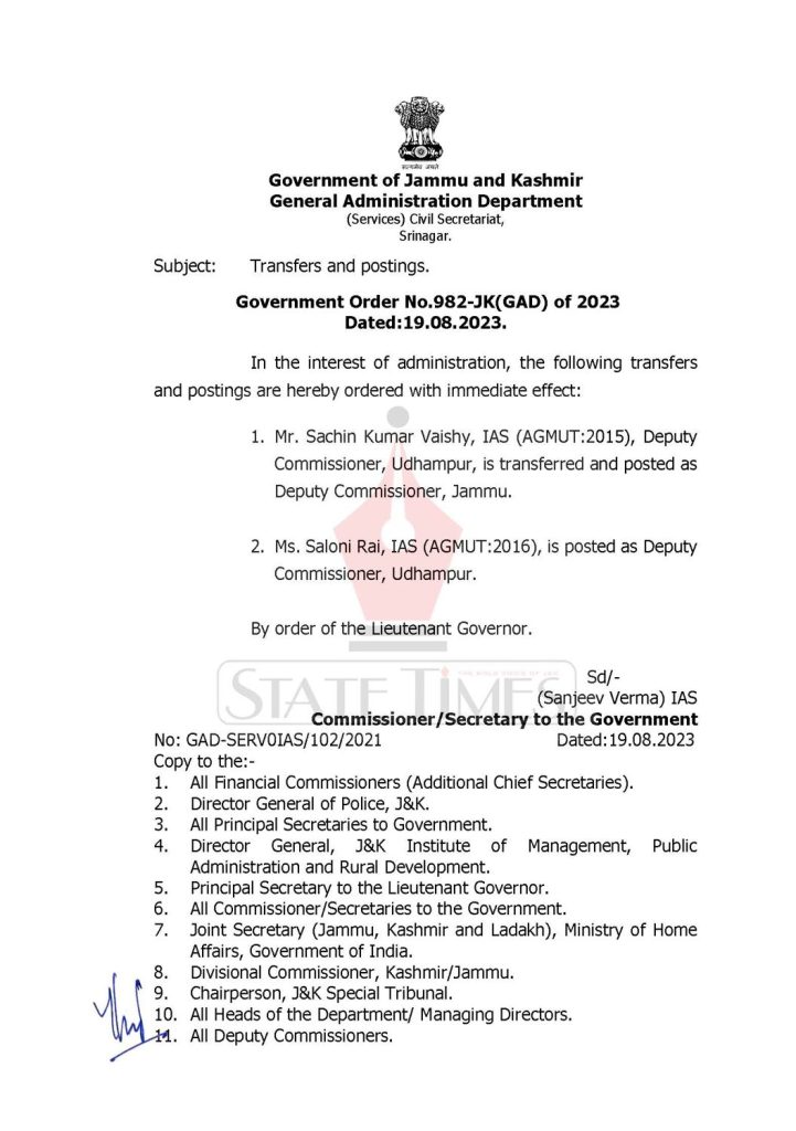 According to an order issued by the General Administration Department (GAD), Deputy Commissioner Udhampur Sachin Kumar Vaishy, IAS (AGMUT:2015) has been transferred and posted as Deputy Commissioner, Jammu, replacing Avny Lavasa while Saloni Rai, IAS (AGMUT: 2016) has been posted as the new Deputy Commissioner, Udhampur.