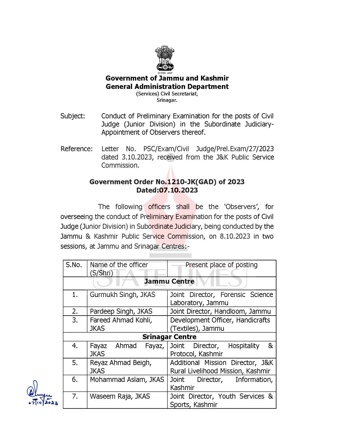 The following officers shall be the ‘Observers’, for overseeing the conduct of Preliminary Examination for the posts of Civil Judge (Junior Division) in Subordinate Judiciary, being conducted by the Jammu & Kashmir Public Service Commission, on 8.10.2023 in two sessions, at Jammu and Srinagar Centres, read order below.