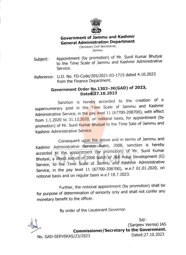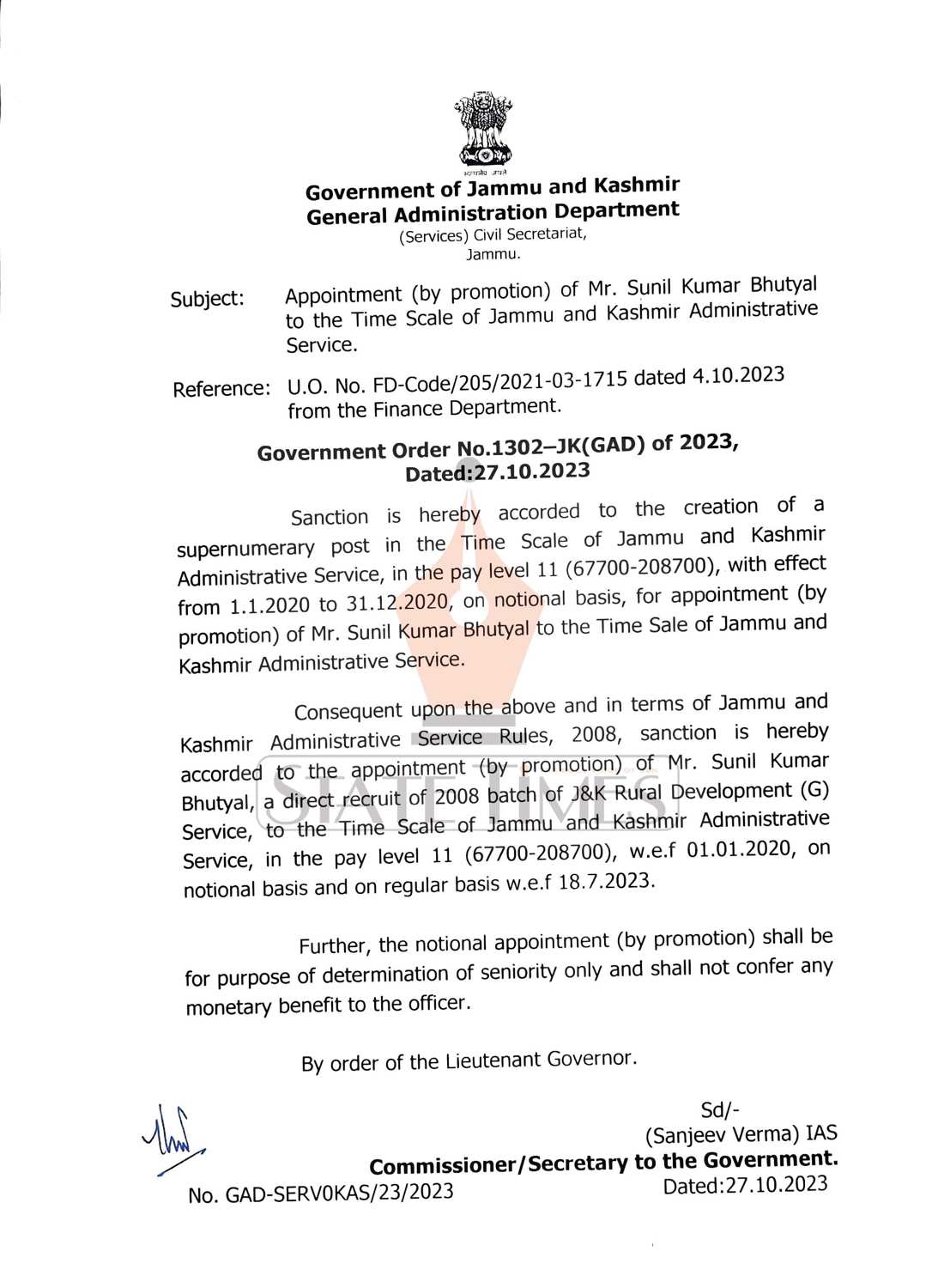 Sanction is hereby accorded to the creation of a supernumerary post in the Time Scale of Jammu and Kashmir Administrative Service, in the pay level 11 (67700-208700), with effect from 1.1.2020 to 31.12.2020, on notional basis, for appointment (by promotion) of Sunil Kumar Bhutyal to the Time Sale of Jammu and Kashmir Administrative Service, read complete order below.