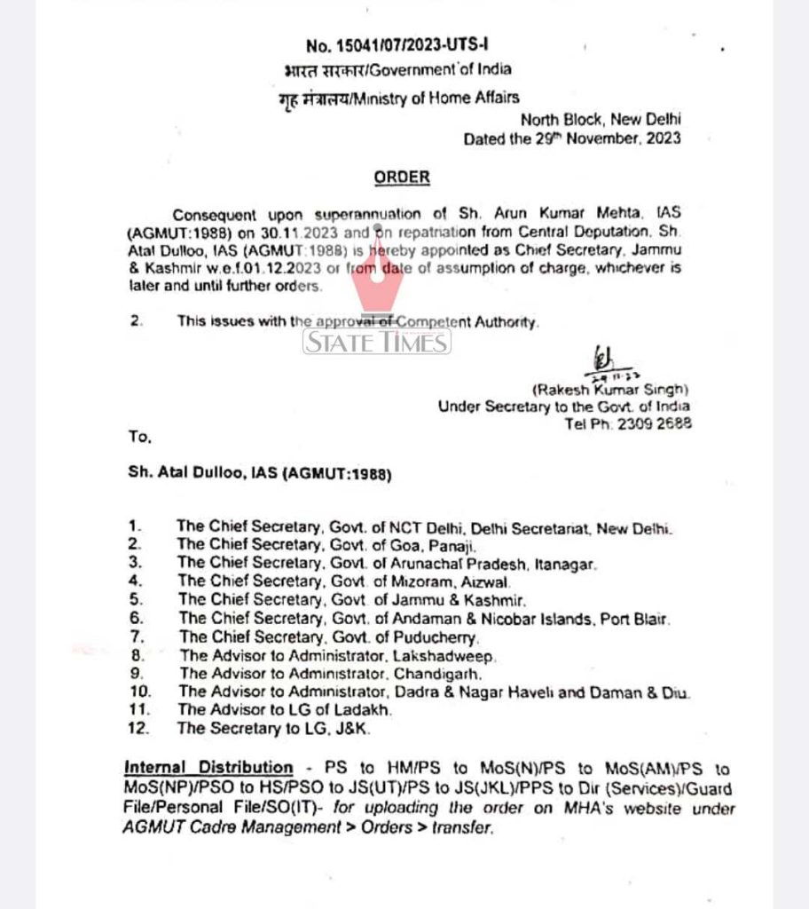 “Consequent upon the superannuation of Arun Kumar Mehta, IAS on 30.11.2023 and on repatriation from central deputation, Atal Dulloo, IAS is hereby appointed as Chief Secretary, Jammu and Kashmir with effect from 01.12.2023 or from date of assumption of charge, whichever is later and until further orders,” the ministry said in an order on Wednesday.
