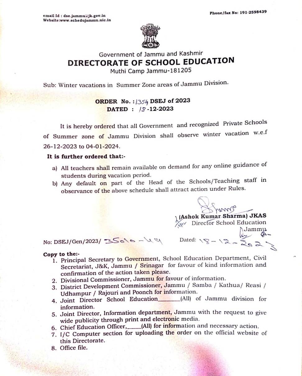 DSEJ announces winter vacation for its summer zones from Dec-26 admin December 18, 2023 Image Gallery Jammu Jammu and Kashmir Latest News Top J&K News