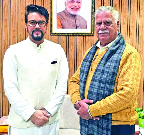New Delhi: Former Minister, Ex MLA and senior BJP leader, Sukhnandan Choudhary met with Anurag Thakur, Minister for Information & Broadcasting, Sports & Youth Affairs, Govt of India at his residence New Delhi and discussed matter regarding promoting sports in rural areas of Jammu and Kashmir. Choudhary said, “The youth in rural areas have great potential which must be boosted by providing them good sports amenities and this will also help in keeping youth away from drugs and keep them physically fit and motivated towards their dreams.” Choudhary added, “The youth in rural areas lag behind in sports infrastructure which make them feel disappointed in comparison to urban areas. So much efforts are required in such areas and such infrastructure must be provided at Panchayat level.” Choudhary said this will practically implement the dream of “Fit India” in ground level and help making society drugs free when such initiatives reaches at Panchayat levels.