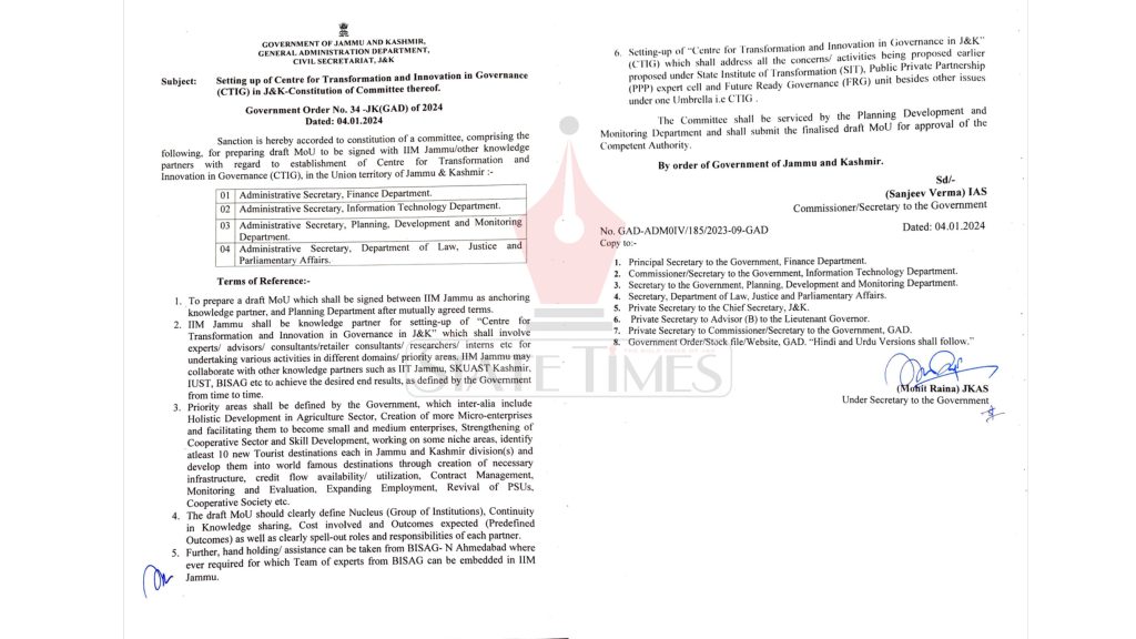 Sanction is hereby accorded to constitution of a committee, comprising the following, for preparing draft MoU to be signed with IIM Jammu/other knowledge partners with regard to establishment of Centre for Transformation and Innovation in Governance (CTIG), in the Union territory of Jammu & Kashmir, read complete order below.