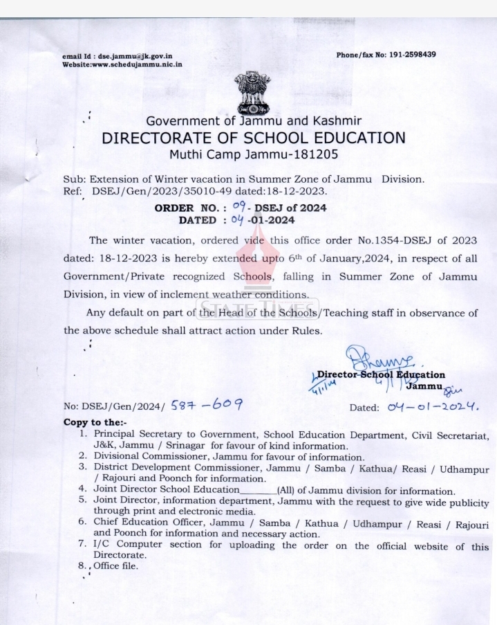 “The winter vacations are hereby extended upto 6th of January, 2024, in respect of all Government/Private recognized Schools, falling in Summer Zone of Jammu Division, in view of inclement weather conditions.