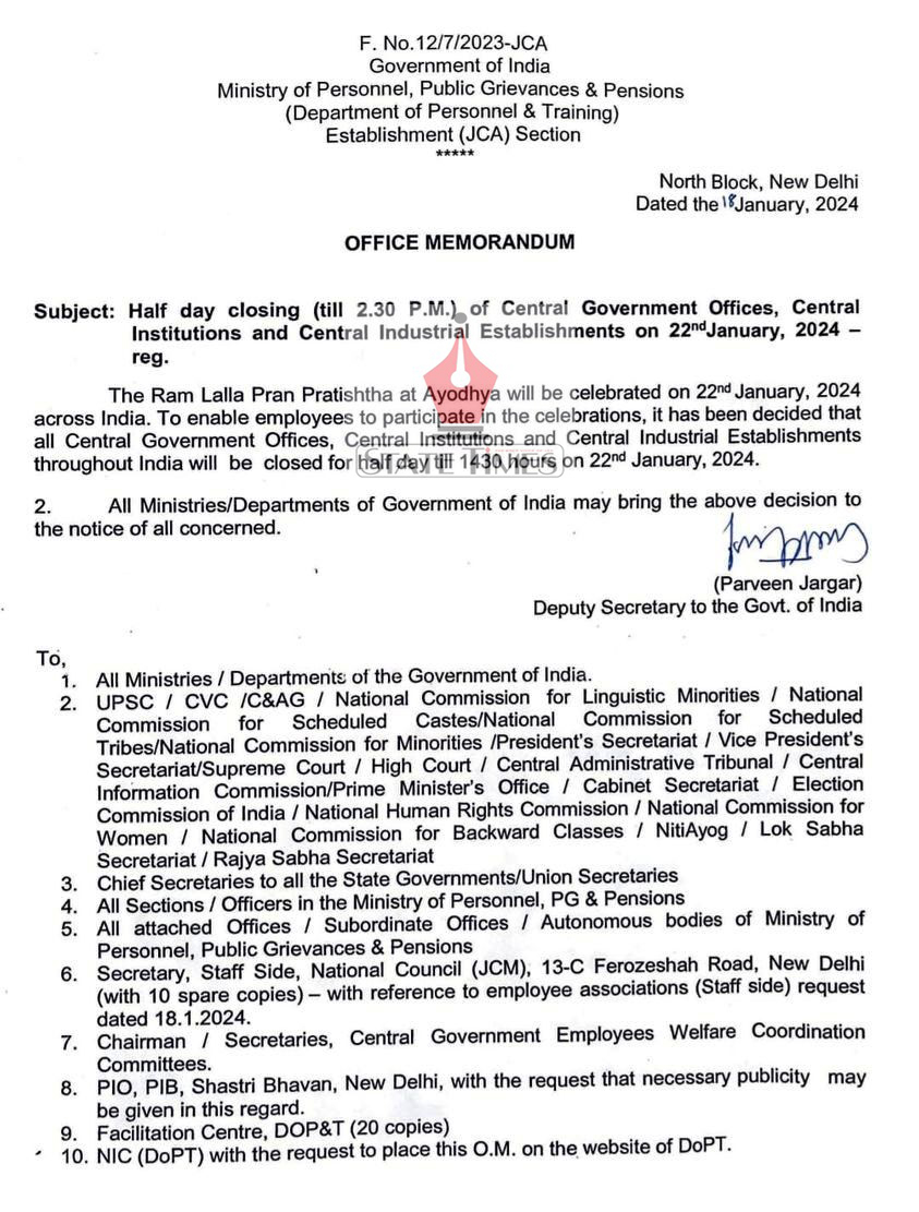 Central Government offices across India to remain close for half day on 22 January, 2024 in view of Ram Lalla Pran Pratishtha ceremony at Ayodhya. admin January 18, 2024 Image Gallery National