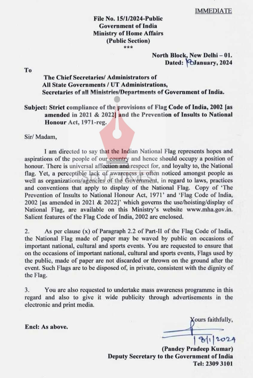 Ahead of R- Day, MHA directs States, UTs to ensure strict compliance of flag code. admin January 19, 2024 Image Gallery Jammu Jammu and Kashmir Kashmir Latest News Top J&K News