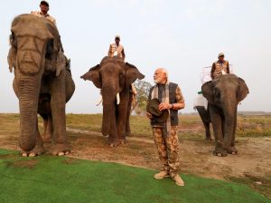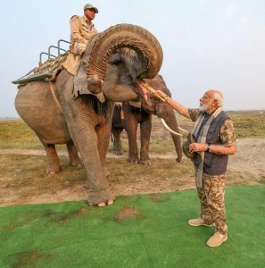 Modi, donning jungle fatigue, a jacket and a hat, rode an elephant named ‘Pradyumna’ whose mahout was Raju, and passed through the safari route of Dagland and Foliomari area, the official said.