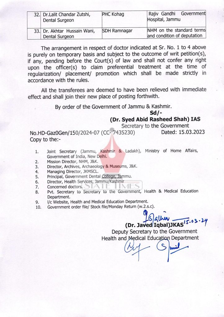 33 doctors transferred admin March 16, 2024 Image Gallery Jammu Jammu and Kashmir Latest News Top J&K News