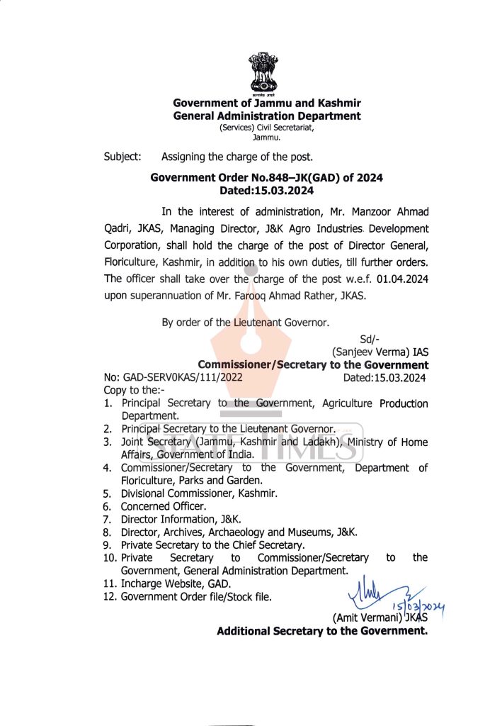 In the interest of administration Manzoor Ahmad Qadri, JKAS, Managing Director, J&K Agro Industries. Development Corporation, shall hold the charge of the post of Director General, Floriculture, Kashmir, in addition to his own duties, till further orders.  The  officer shall take over the charge of the post w.e.f. 01.04.2024 upon superannuation of Faroog Ahmad Rather, JKAS.
