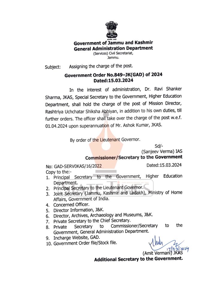 Dr. Ravi Shanker Sharma, JKAS, Special Secretary to the Government, Higher Education Department, shall hold the charge of the post of Mission Director, Rashtriya Uchchatar Shiksha Abhiyan, in addition to his own duties, till further orders. The officer shall take over the charge of the post w.e.f. 01.04.2024 upon superannuation of Ashok Kumar, JKAS, read complete order below.