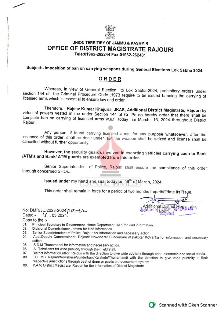 #DM Rajouri imposes ban on carrying #weapons during LS elections admin March 17, 2024 Cities & Towns Image Gallery Jammu and Kashmir Latest News