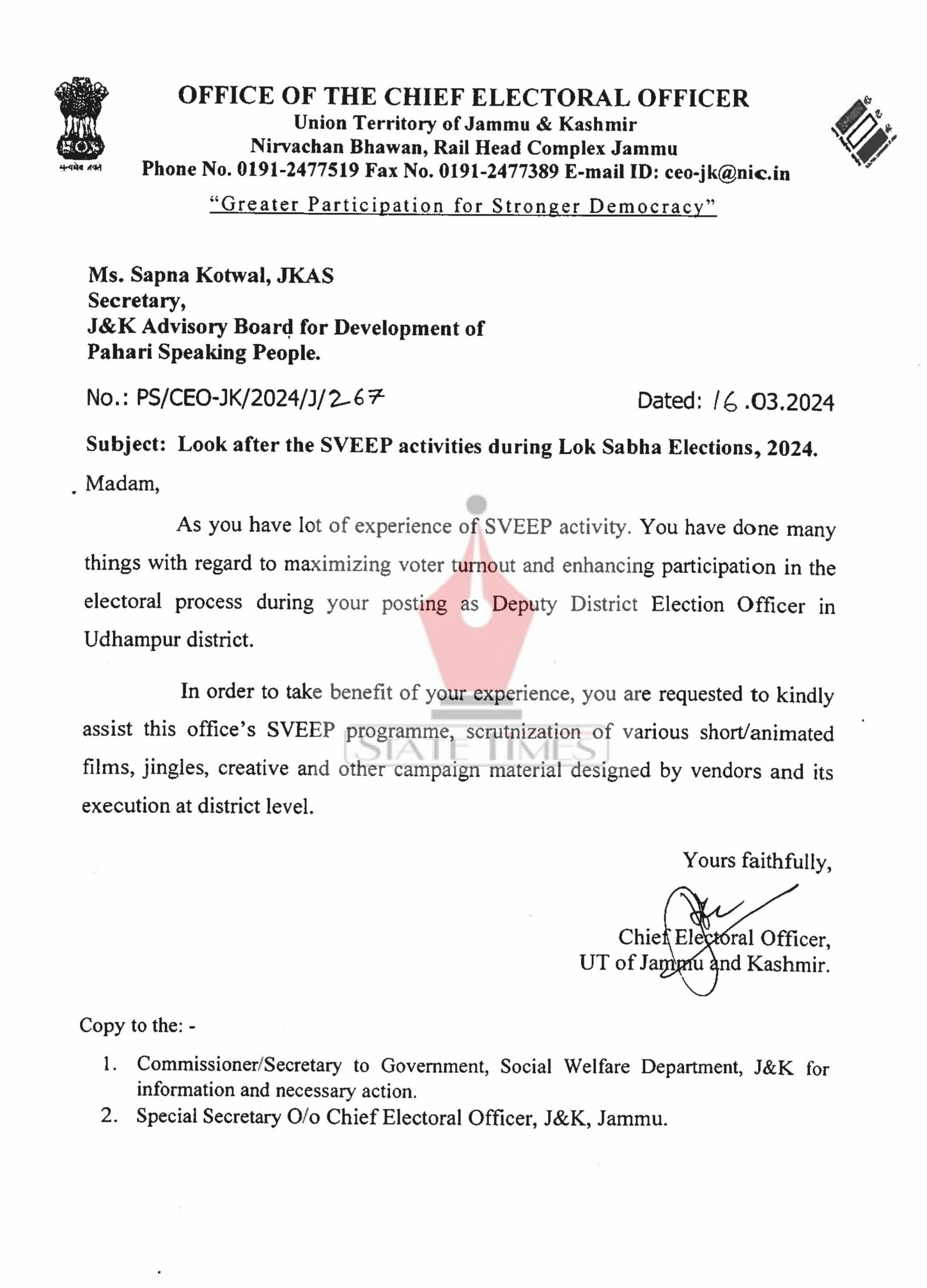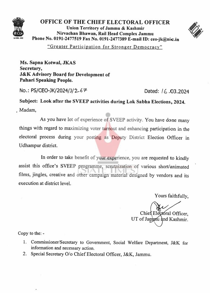 Sapna Kotwal to assist CEO’s SVEEP programme. admin March 17, 2024 Image Gallery Jammu Jammu and Kashmir Latest News Top J&K News