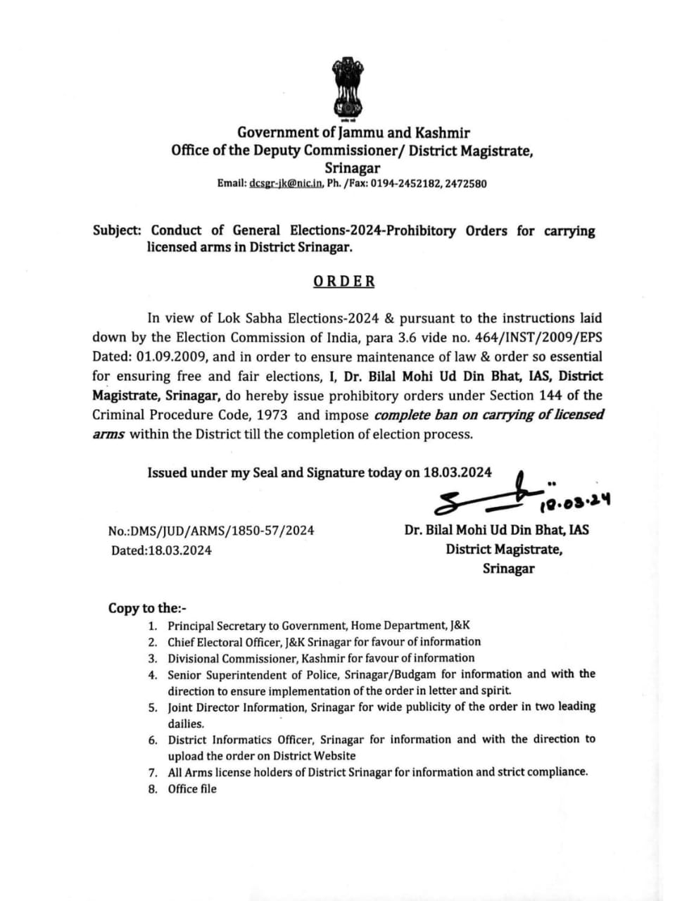Lok Sabha Elections 2024: DM Srinagar imposes ban on carrying licensed arms in Srinagar