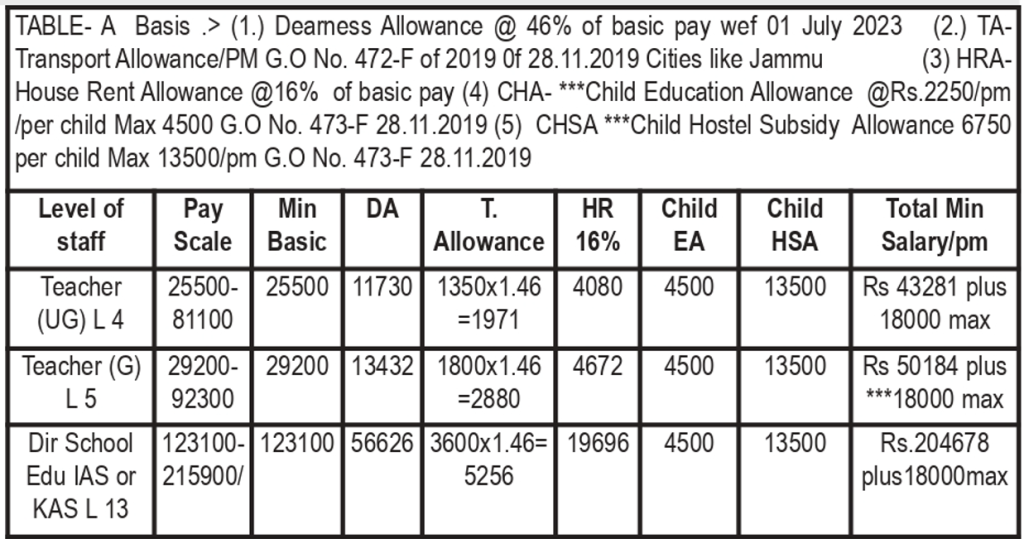 Had we been able to provide quality education to the under privileged from amongst us instead of symbolic material assistances / subsidies the numbers needing special supports would have reduced over the years instead of increasing. Governments have spent billions of rupees on the school education infrastructure and inspite the teachers in government schools having much much superior wage structure and job security in comparison to most of the private schools /academies even those employed in school education departments are not found sending there own wards in government schools even in cities what to talk of villages, This sends a wrong message to common people about the quality of education imparted in Government Schools to the extent that these days even a labour earning just Rs.500 a day through his/ her hard labour is seen rushing to a local private school / academy where he/ she pays a tuition fee of Rs 300 to Rs.1000 per month per child and also spends similar amount for private tuition after school even when Government pays atleast Rs. 50000 plus other special allowances to a lowest level undergraduate school teacher where as the teachers in private academies are mostly being paid not more than Rs. 10000 to Rs.15000 per month with almost no job security (see table A ) . The teachers teaching higher classes in government schools are paid much higher.