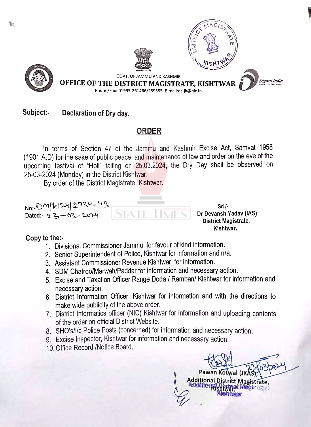 Order regarding Declaration of Dry Day on the eve of the upcoming festival of “Holi” falling on 25-03-2024. admin March 23, 2024 Image Gallery Jammu Jammu and Kashmir Kashmir Latest News Top J&K News