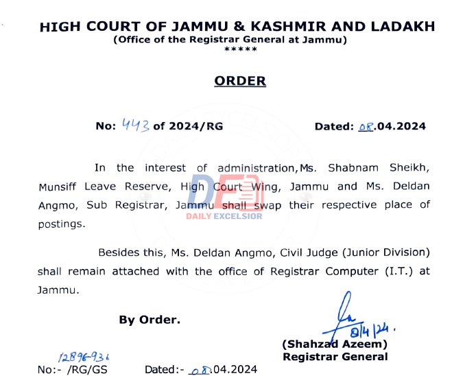 JAMMU, Apr 8: High Court has ordered swapping of place of posting of two Judicial Officers.