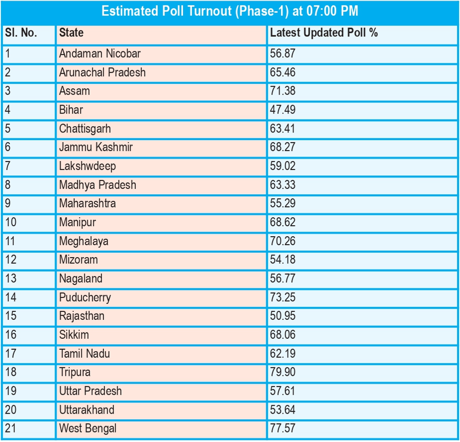 New Delhi: A voter turnout of over 60 per cent was recorded in the first phase of Lok Sabha elections covering 102 seats across 21 states and Union territories amid sporadic incidents of violence at some places and an accidental explosion of a grenade launcher shell in Chhattisgarh that left a CRPF jawan dead.