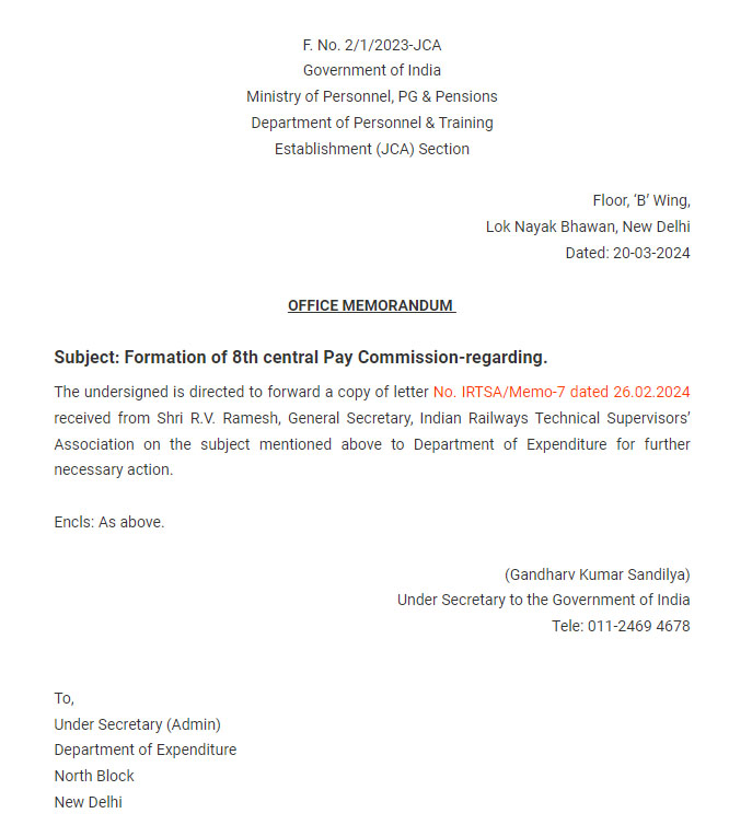 Formation Of 8th Central Pay Commission | DoP&T Forwards IRTSA Memo To Ministry Of Finance