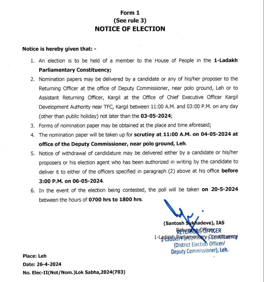 The post Lok Sabha Elections | Nominations Open For Ladakh Seat appeared first on Daily Excelsior.