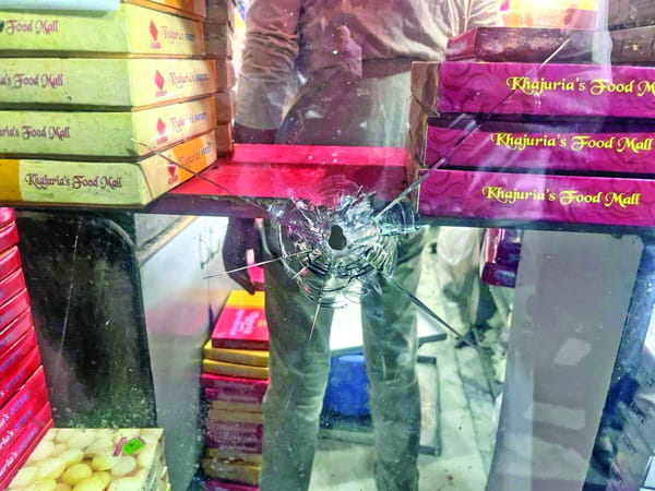 According to reports, unknown gangsters on a scooter approached the sweetshop, with their faces covered, and one of them fired at the mall, shattering the windowpanes and glasses.