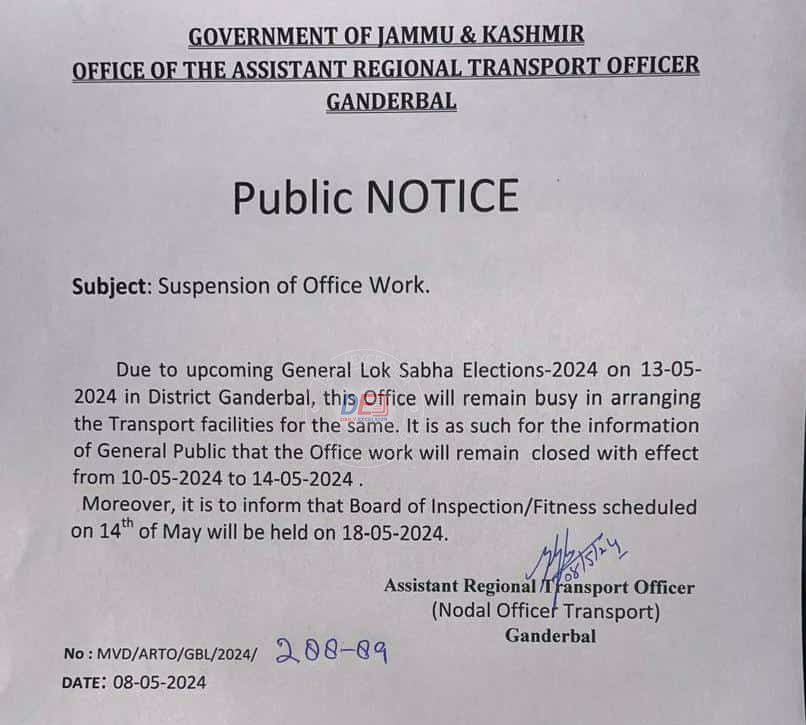 SRINAGAR, May 8: In view of the General Elections and the expected business of the ARTO staff in arranging transport facilities, the ARTO Ganderbal has announced suspension of office work from May 10 to May 14, 2024.