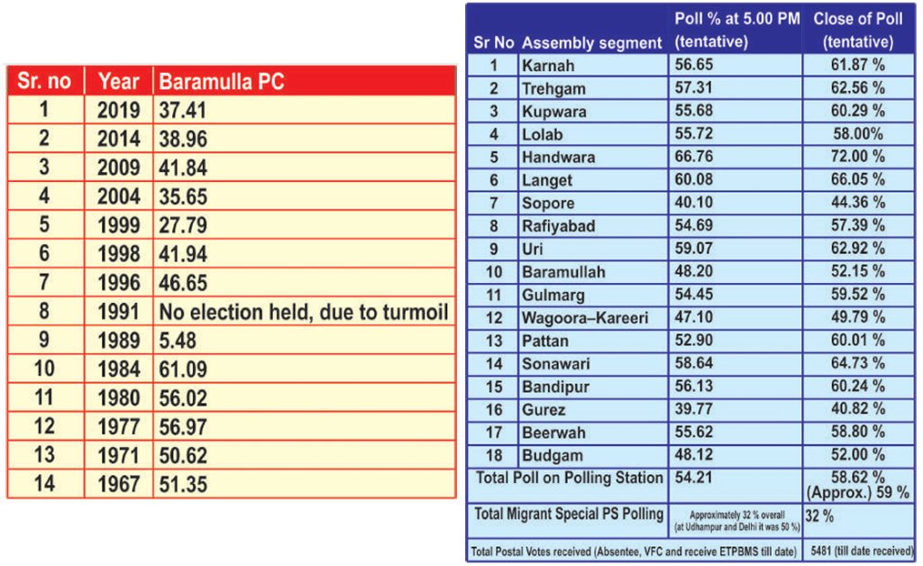 The highest ever poll percentage in Baramulla Parliamentary Constituency, since the eruption of terrorism in Kashmir was recorded in year 1996 with 46.65 per cent and in the history of Baramulla PC, highest poll percentage was (approx.) 61.09 per cent in year 1984. This year’s poll percentage is definitely second highest in democratic history of Baramulla PC and may likely to be highest, as final figures are yet to reach from remote areas and also two assembly segments- Budgam and Beerwah have been added in recent de-limitation, we can say it is highest for the Baramulla PC in today’s size.