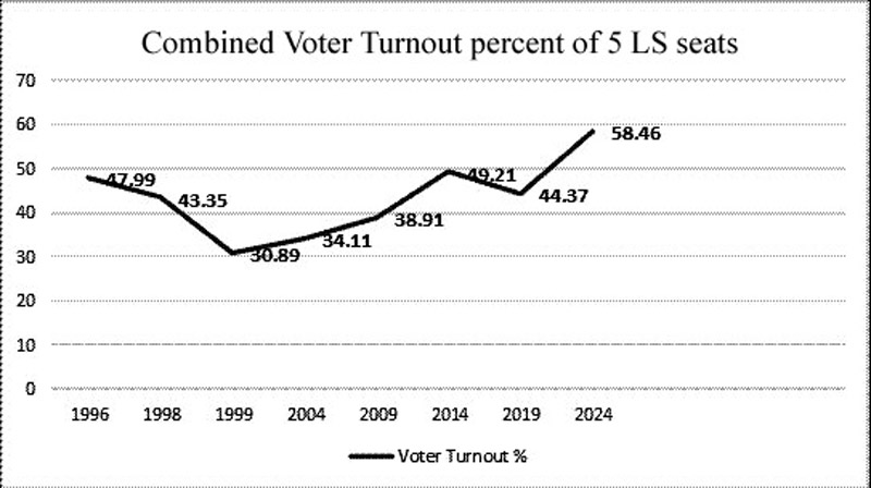 An official statement issued by the ECI after conclusion of Parliamentary electoral process in Jammu and Kashmir said the UT witnessed its highest poll participation in last 35 years. The Combined Voter Turnout (VTR) at the Polling Stations for all five Lok Sabha seats was 58.46 percent.