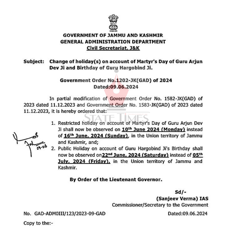 #Guru Arjun Dev’s Shaheedi Diwas, Guru Hargobind’s Jyanti holidays rescheduled admin June 9, 2024 Jammu Jammu and Kashmir Kashmir Latest News Top J&K News