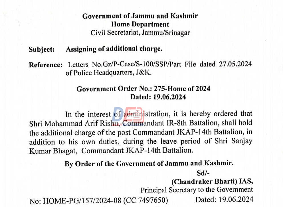 JAMMU, June 19: The Jammu and Kashmir Government today assigned to Mohammad Arif Rishu, Commandant, IR-8th Battalion, the additional charge of the post of Commandant JKAP-14th Battalion, in addition to his own duties, during the leave period of Sanjay Kumar Bhagat, Commandant JKAP-14th Battalion.