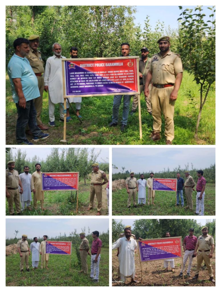 Police after obtaining attachment order passed by Hon’ble Court Baramulla, attached properties (9 Kanals) land worth Rs 1 crore belonging to five Pakistan-based terror handlers. The terror handlers have been identified as Bashir Ahmad Ganie son of Gh Ahmad resident of Tilgam, Mehraj-ud-din Lone son of Fata Mohd resident of Khargam, Ghulam Mohd Yatoo son of Gh Ahmad resident of Tilgam, Ab Rehman Bhat son of Mohd Subhan resident of Wanigam Payeen & Ab Rashid Lone son of Gh Mohiuddin resident of Satreseeran.