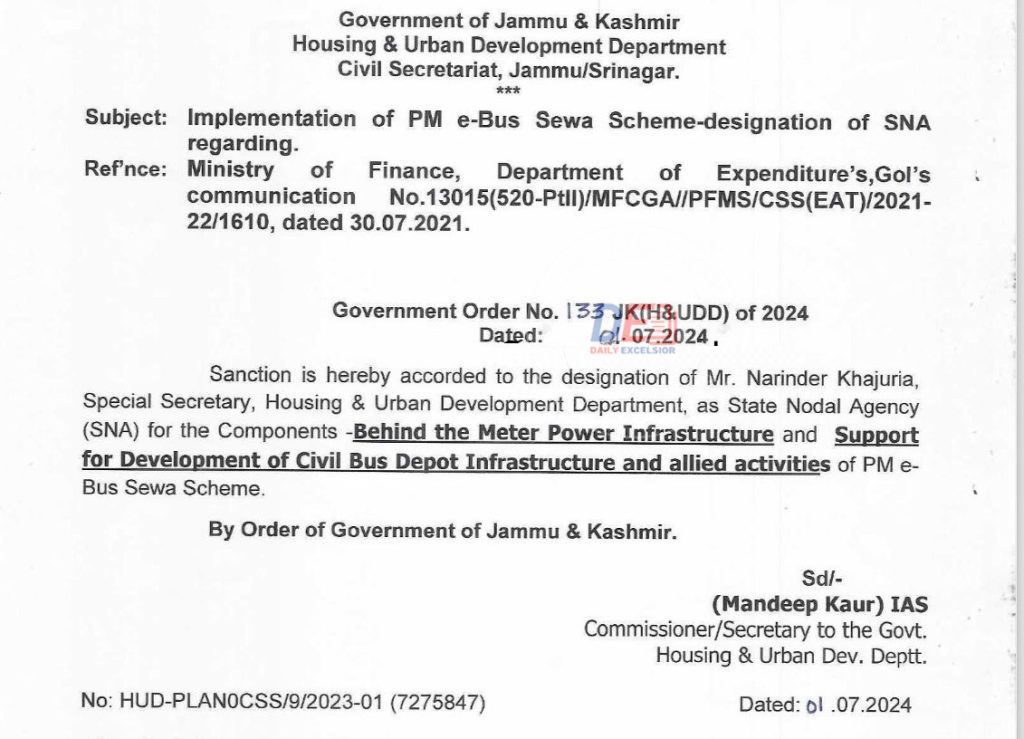 JAMMU, July 2: The Government of Jammu and Kashmir has designated Narinder Khajuria, Special Secretary, House and Urban Development Department as the State Nodal Agency (SNA) for the implementation of different components of PM e-Bus Sewa Scheme.