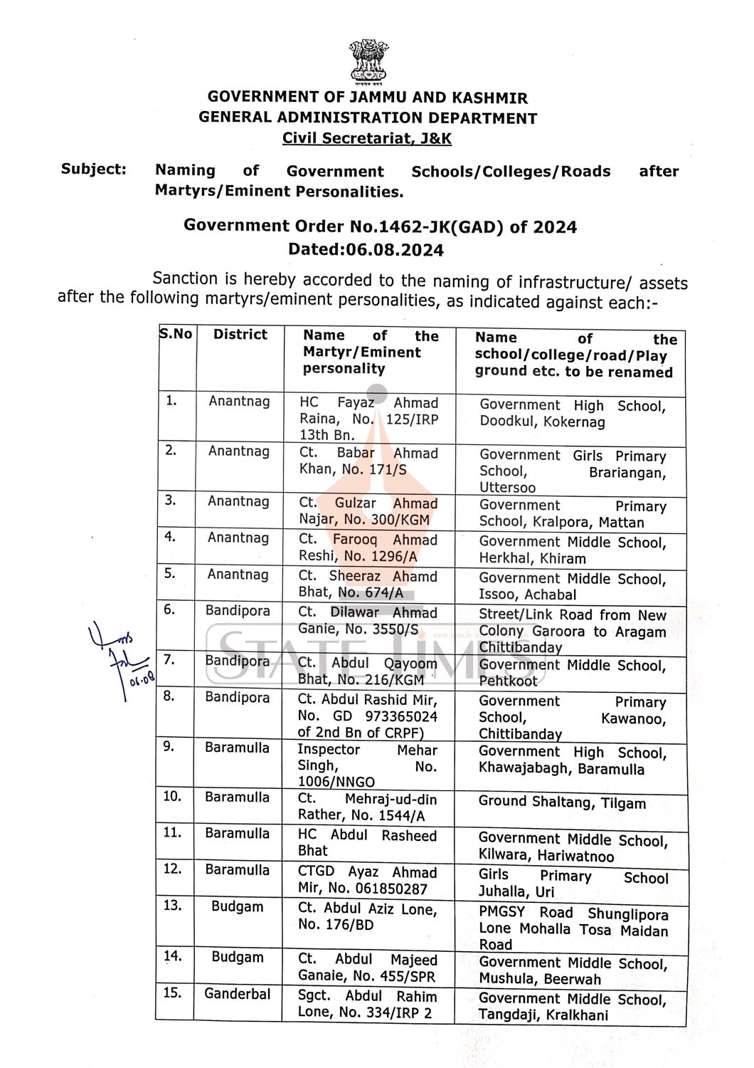 Sanction is hereby accorded to the naming of infrastructure/ assets after the following martyrs/eminent personalities, as indicated against each, read complete order below.