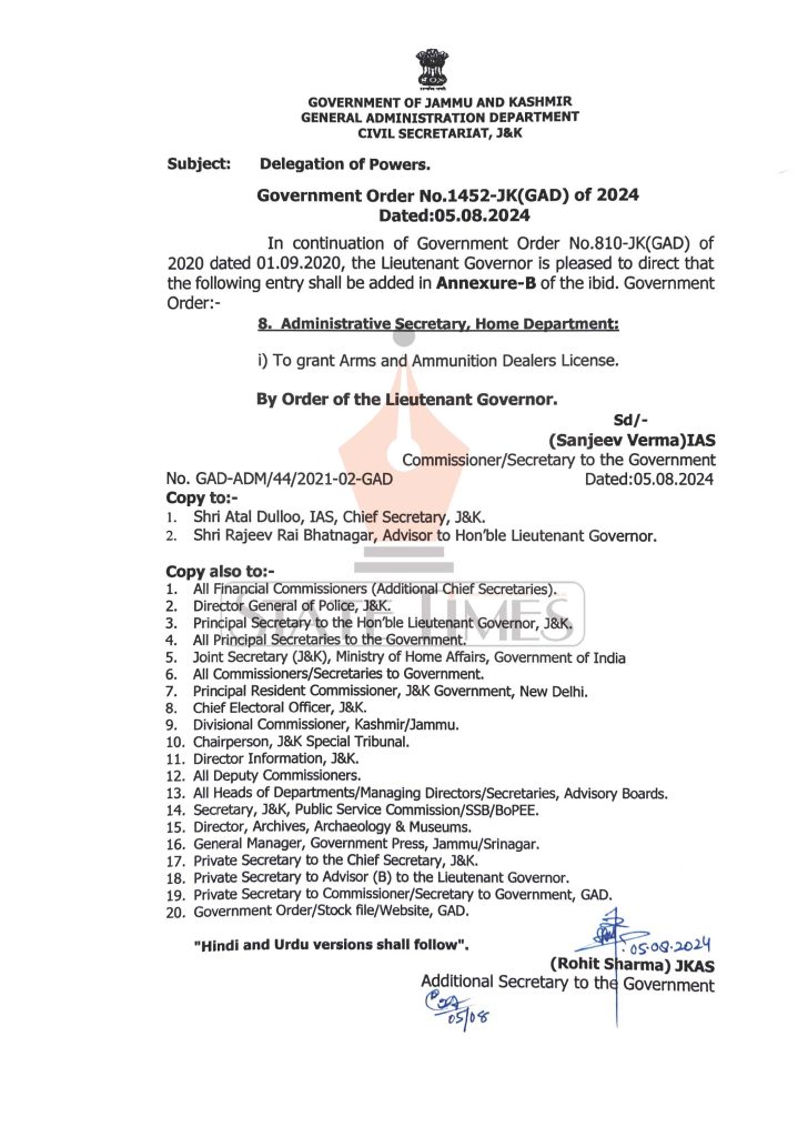 “In continuation of Government Order No. 810-JK(GAD) of 2020 dated September 1, 2020, the Lieutenant Governor is pleased to direct to authorize Administrative Secretary, Home Department to grant Arms and Ammunition Dealers License,” reads an order issued on Monday by Sanjeev Verma, Comm-issioner/ Secretary, GAD.