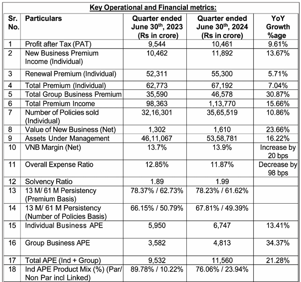 The Total Premium Income for quarter ended June 30th, 2024 was Rs. 1,13,770 crore as compared to Rs. 98,363 crore for the quarter ended June 30th 2023, registering a growth of 15.66%. The Total Individual Business Premium for the quarter ended June 30th, 2024 increased to Rs. 67,192 crore from Rs. 62,773 crore for the comparable period of previous year, showing an increase of 7.04%. The Group Business total premium income for quarter ended June 30th, 2024 was Rs. 46,578 crores as compared to Rs 35,590 crore for the quarter ended June 30th 2023, showing an increase of 30.87%.