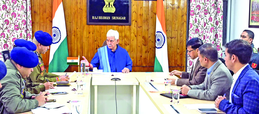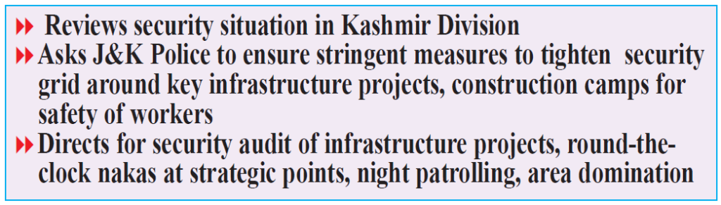 Chairing a review meeting at Raj Bhawan on the security situation in the Kashmir Division, the Lieutenant Governor directed the police to conduct security audit of infrastructure projects, round-the-clock nakas at the strategic points, night patrolling and area domination. He said the police must ensure robust security and intelligence grid and intensified, well-planned joint operation with army and other security agencies to eliminate terrorism.