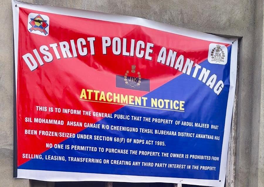 ANANTNAG: In a decisive action against drug trafficking and its financial networks, Police in Anantnag has attached a double-storey under-construction residential house belonging to Abdul Majeed Bhat son-in-law of Mohammad Ahsan Ganaie resident of Cheenigund, Srigufwara. The property, spread over 1 Kanal of land and valued at Rs 1 crore, has been attached under Section 68-F of the NDPS Act, as it has been linked to proceeds from drug trafficking.