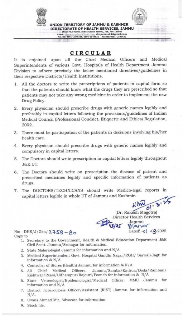JAMMU, Mar 2: The Directorate of Health Services Jammu (DHSJ) has directed all the medical practitioners across Jammu Division to henceforth write the prescription and patient’s medical history in capital letters.
