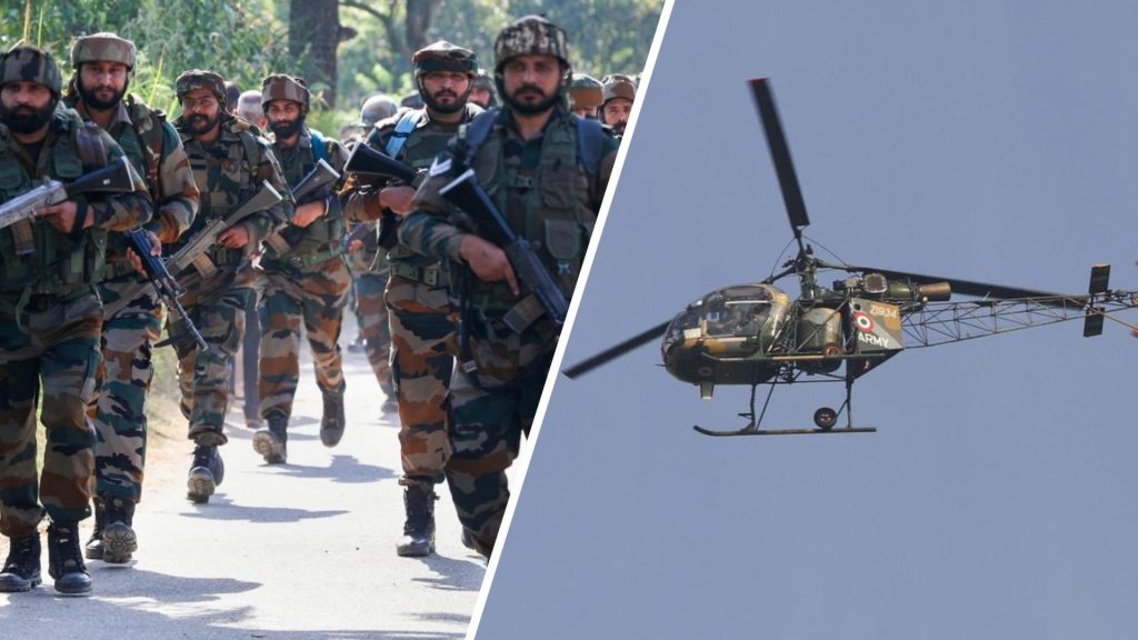 An army helicopter was seen hovering over the area as the joint troops of the army, including commandos equipped with heavy weapons, sniffer dogs, drones and unmanned aerial vehicles continued the search for the terrorists believed to be trapped in the area, the officials said.