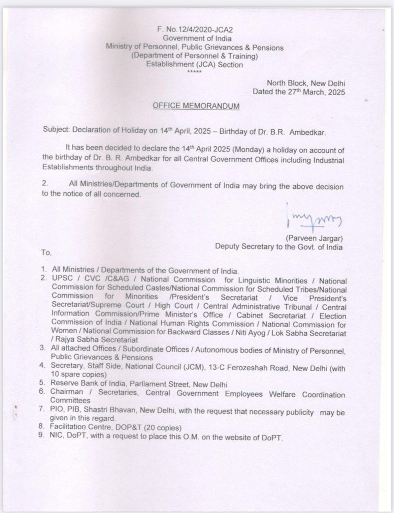 JAMMU, Mar 27: The Ministry of Personnel, Public Grievances, and Pensions, Government of India (GoI) declared a holiday on the birthday of Dr BR Ambedkar on April 14 in all the Central Government offices, including the Industrial Establishments throughout the country.
