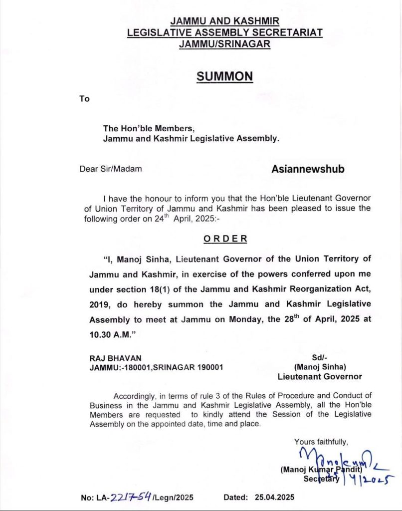 Jammu, Apr 25: In the wake of the recent terror attack in Pahalgam, the Jammu and Kashmir Legislative Assembly has been summoned to convene on Monday, April 28, 2025, at 10:30 A.M. in Jammu.