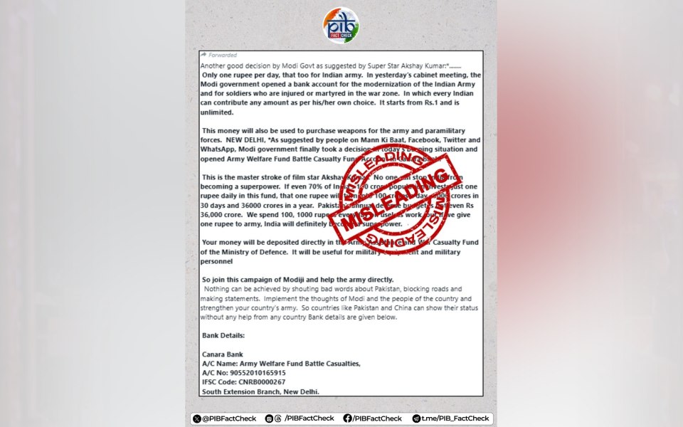 “A WhatsApp message is going around claiming that government has opened a bank account for the modernization of the Indian Army. #PIBFactCheck This claim is MISLEADING. The bank account mentioned in the message is NOT meant for modernization of Indian Army or for purchase of weapons,” it posted on X.