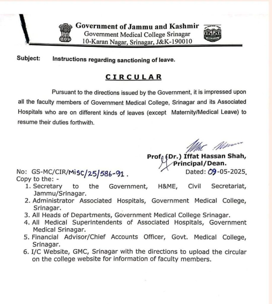 SRINAGAR, May 9: SRINAGAR, May 9: The Health and Medical Education Department has directed those employees of the Government Medical College Srinagar and its Associated Hospitals who are on leave, to resume their duties.