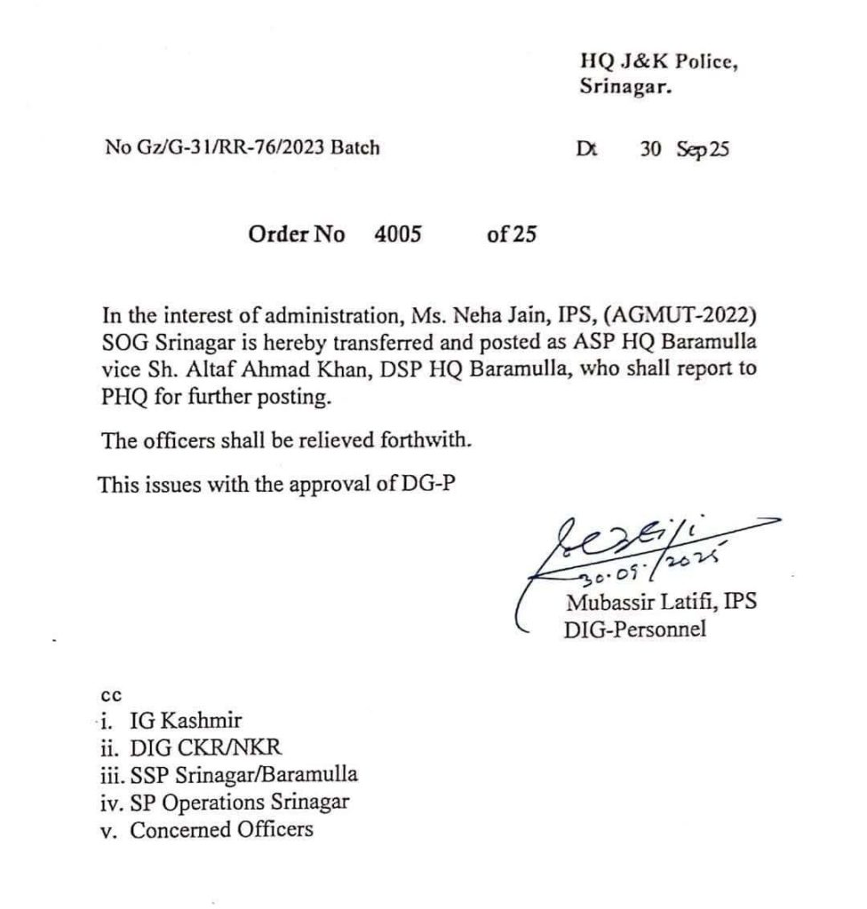 Srinagar, Oct 1: The Jammu and Kashmir Police have transferred Neha Jain, a 2022 batch IPS officer of AGMUT cadre, from the Special Operations Group (SOG) Srinagar and posted her as ASP Headquarters Baramulla, replacing Altaf Ahmad Khan, DSP Headquarters Baramulla, who has been directed to report to Police Headquarters for further posting.