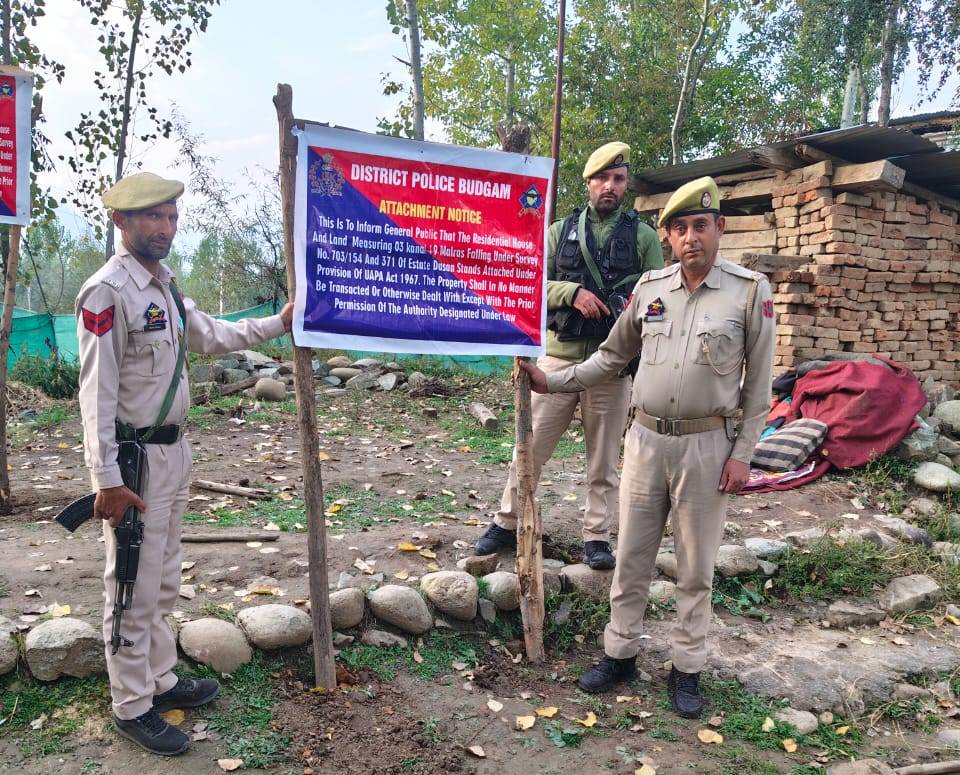 The property, measuring 3 kanals (1 kanal is equal to 5,445 sq ft) and 19 marlas (1 marla is equal to 272.251 sq ft), is located in Dasan, Beerwah. It was attached after obtaining prior approval from the competent authority, the police spokesperson said.