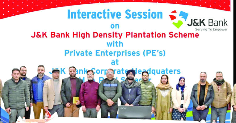 SRINAGAR: With a view to further strengthen and streamline the implementation of its flagship High Density Plantation (HDP) Scheme, J&K Bank today organised an interactive session with Private Enterprises (PEs), at it’s corporate headquarters, to seek first-hand feedback and enhance coordination among key stakeholders. Pertinently, the Private Enterprises (PEs) are responsible for providing plantation material and carrying out high-density plantations on the ground.